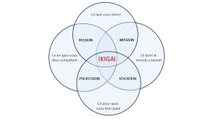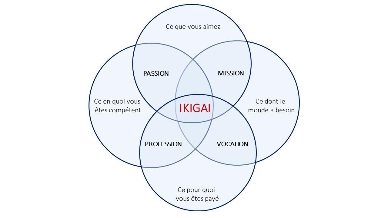 Au centre, se trouve IKIGAI, la conjonction parfaite de la passion, du sentiment d’accomplissement, de l’excellence et du travaiL Le bonheur.