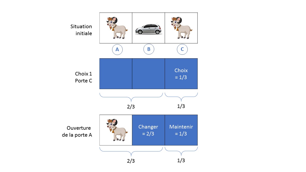 Vous désignez donc une porte au hasard. L’animateur du jeu sait où se trouve la voiture. Il va donc ouvrir une porte qui n’est ni celle que vous avez désignée, ni celle où se trouve la voiture. Vous découvrez donc forcément une chèvre…