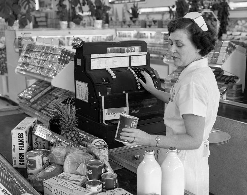Au début des années 50, il fallait 2 opératrices pour traiter le passage en caisse d’un seul client. Une qui prenait le produit, énonçait la nature du produit et son prix, puis le rangeait dans un sac en papier. Sa collègue devait taper le prix, le code produit et le rayon sur sa caisse. Il fallait en moyenne 10 à 15 secondes par article, à deux. Puis on est passé à une seule caissière qui faisait tout… sauf mettre l’article dans le sac !