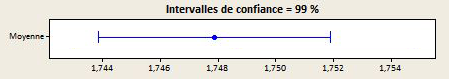 Le point bleu est la valeur observée sur l’échantillon. les 2 traits verticaux délimitent l’intervalle dans lequel la moyenne de la population a 99% de chances de se situer. On affirmera donc que la taille moyenne de la population se situe entre 1,744 m et 1,752 m avec 99% de fiabilité.
